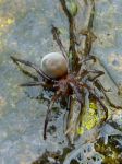 The spiders live in a air filled web dome under the water and mating time the male builds one next to the female dome and knocks a door through in her pad. Frogs are reported to eat them which I find hard to believe. Raft spider moves accross on surface of water. Gaint water beetle is a voracious carnivor.